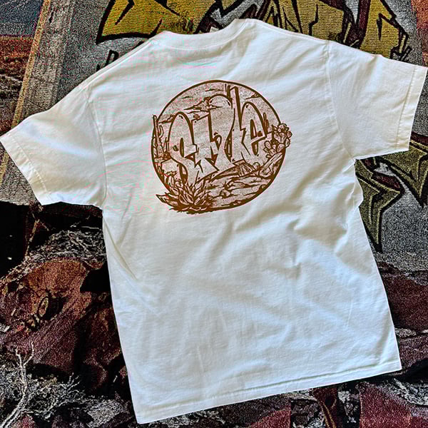 The Desert Life T is an actual piece painted by Style out in the wild on a raw concrete structure.